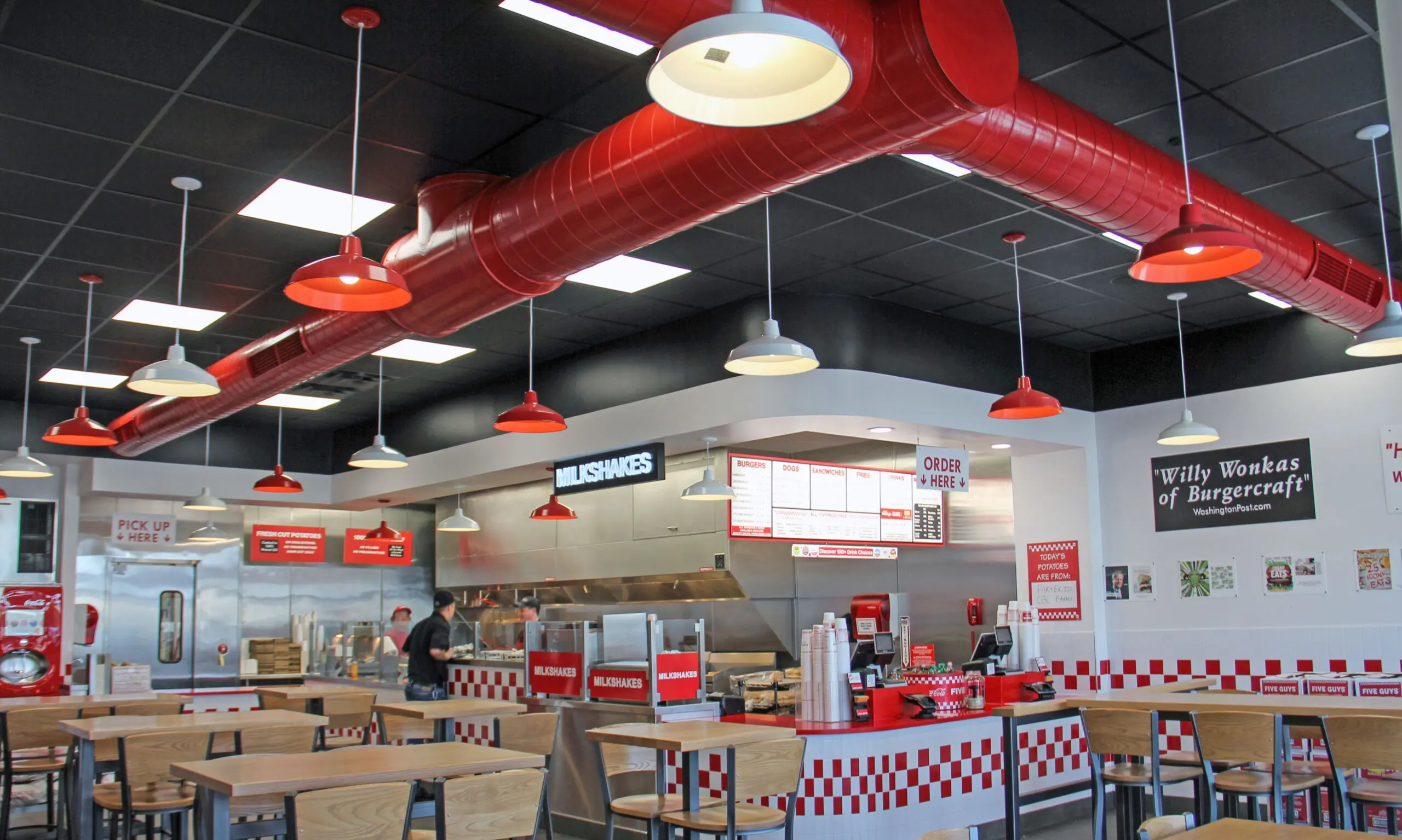 Using fine-finish spraying, the ductwork was coated to look like it was manufactured that way, while crisp transitions between black and white kept the space sharp and true to brand. From the bright whites to the deep reds, every surface was finished to meet the high standards that make Five Guys instantly familiar, no matter the city.