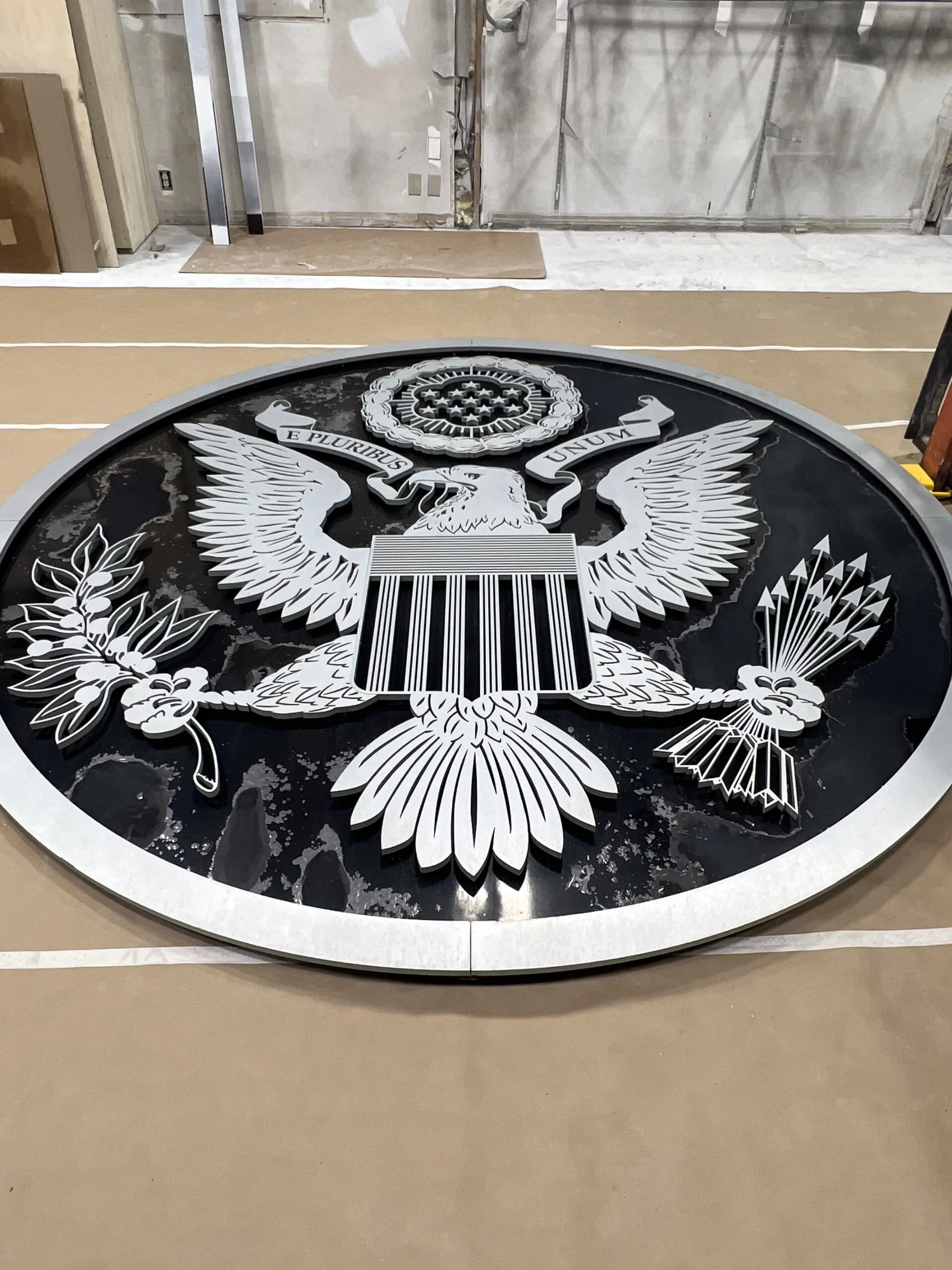 Outside, the task was just as distinctive. Weyer Companies refinished the iconic 8-foot-tall medallion above the Post Office entry. Surprisingly, the hardest part wasn’t the finish itself but the removal and reinstallation of the massive eagle centerpiece. The existing coating had to be stripped with a specialized chemical before being refinished to resemble a coin. To ensure longevity, we applied a two-component black finish followed by a custom sealer, creating a durable and striking result that will withstand the elements for years to come.