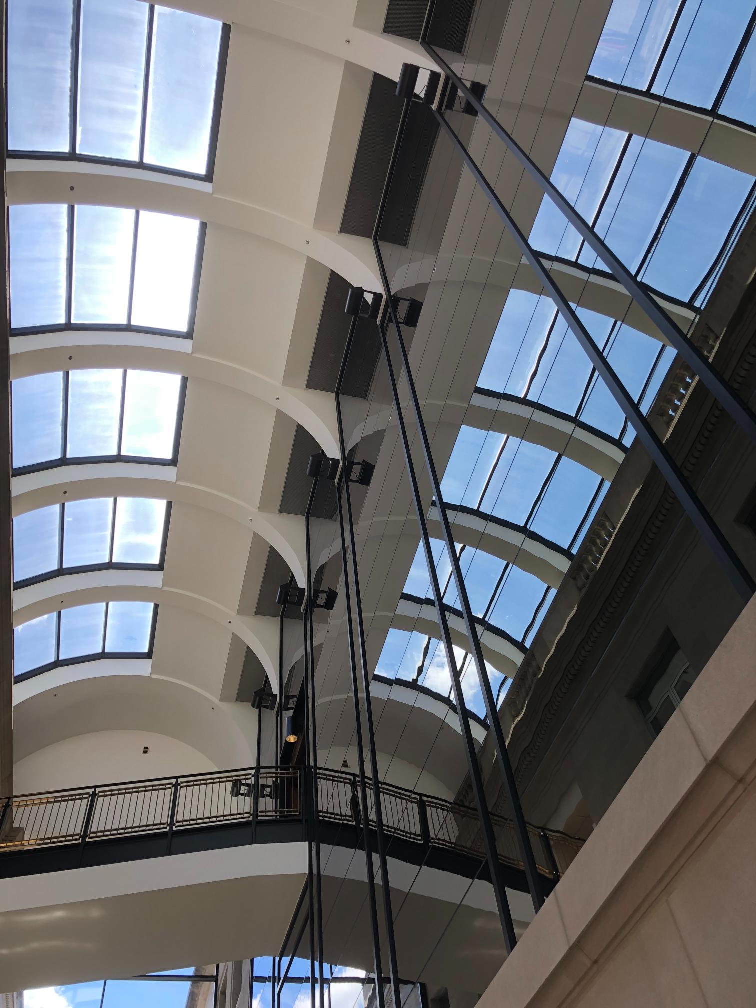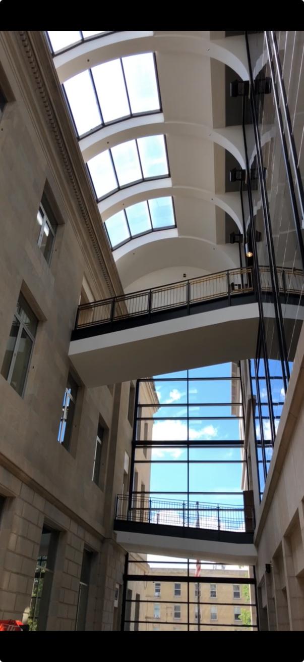 This government project carried a unique set of challenges, from strict daily security vetting to the logistics of bringing a lift inside the building, which required removal of a full glass panel just to gain access. Once inside, our team worked more than 50 feet in the air, repairing extensive water damage and repainting the interior in crisp white to highlight the building’s architectural details.