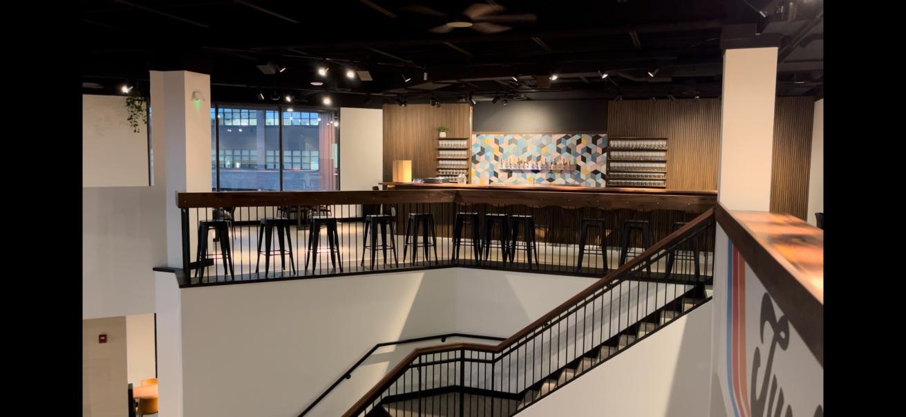 Turning a former bank into a brewery required a full transformation, inside and out. Bar joist ceilings, painted brick, stained handrails, and a refinished metal staircase leading to the rooftop gave the space a bold new identity. Doors, walls, and finishes were repaired, painted, and detailed to create an atmosphere as unique as the brewery itself.