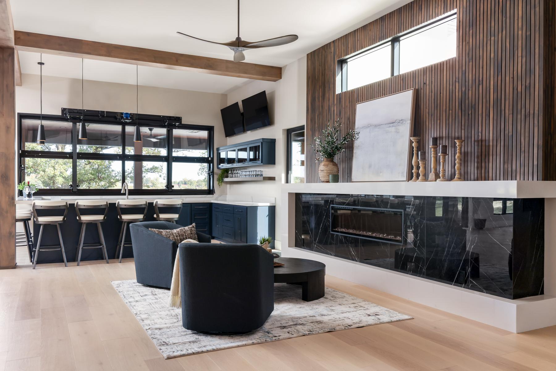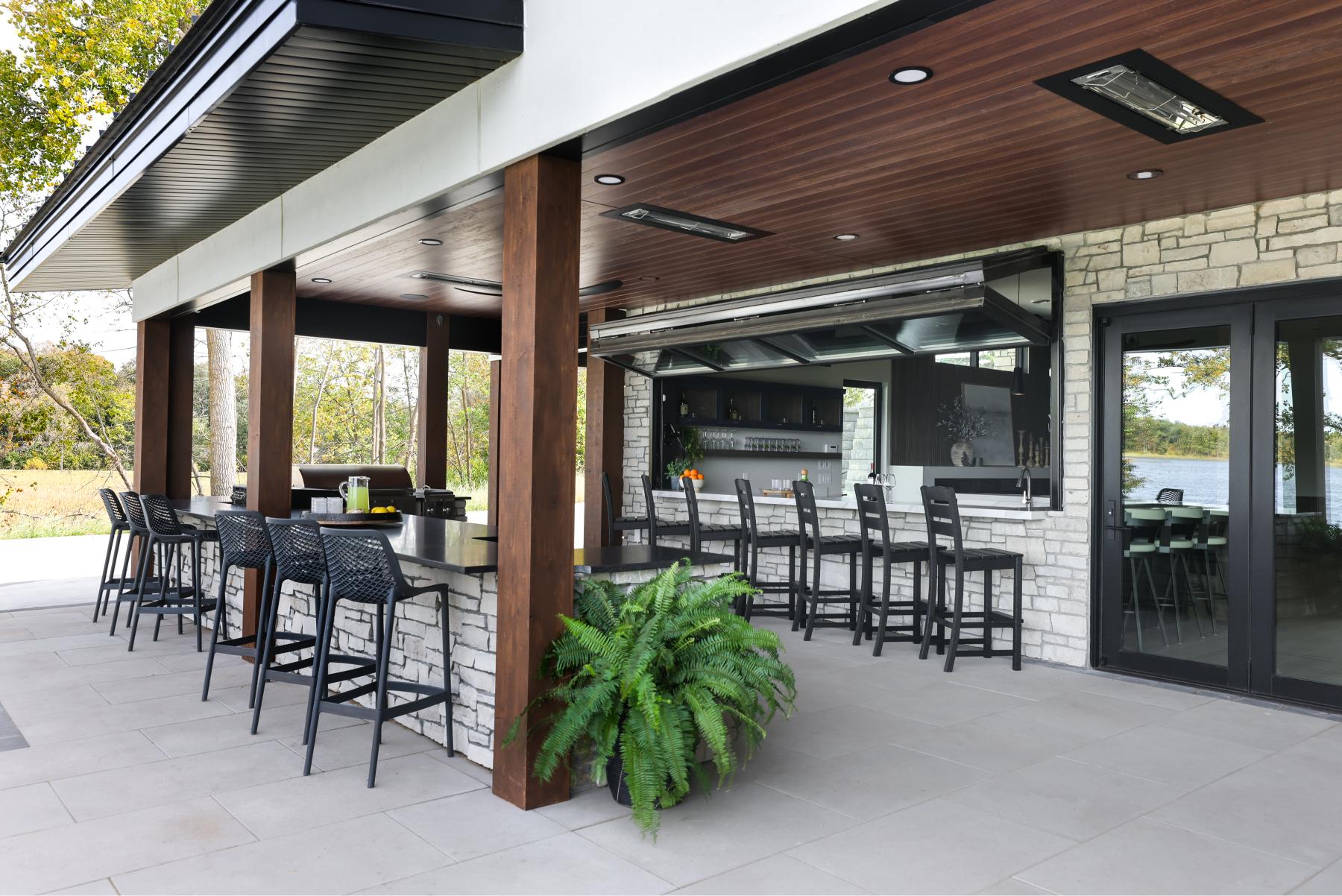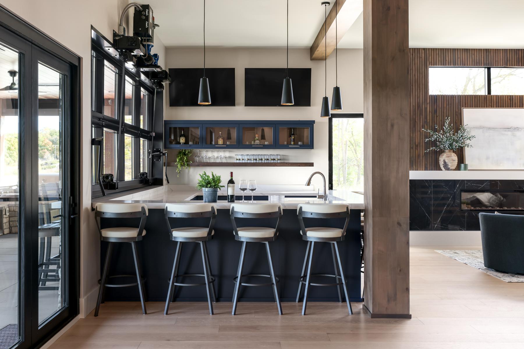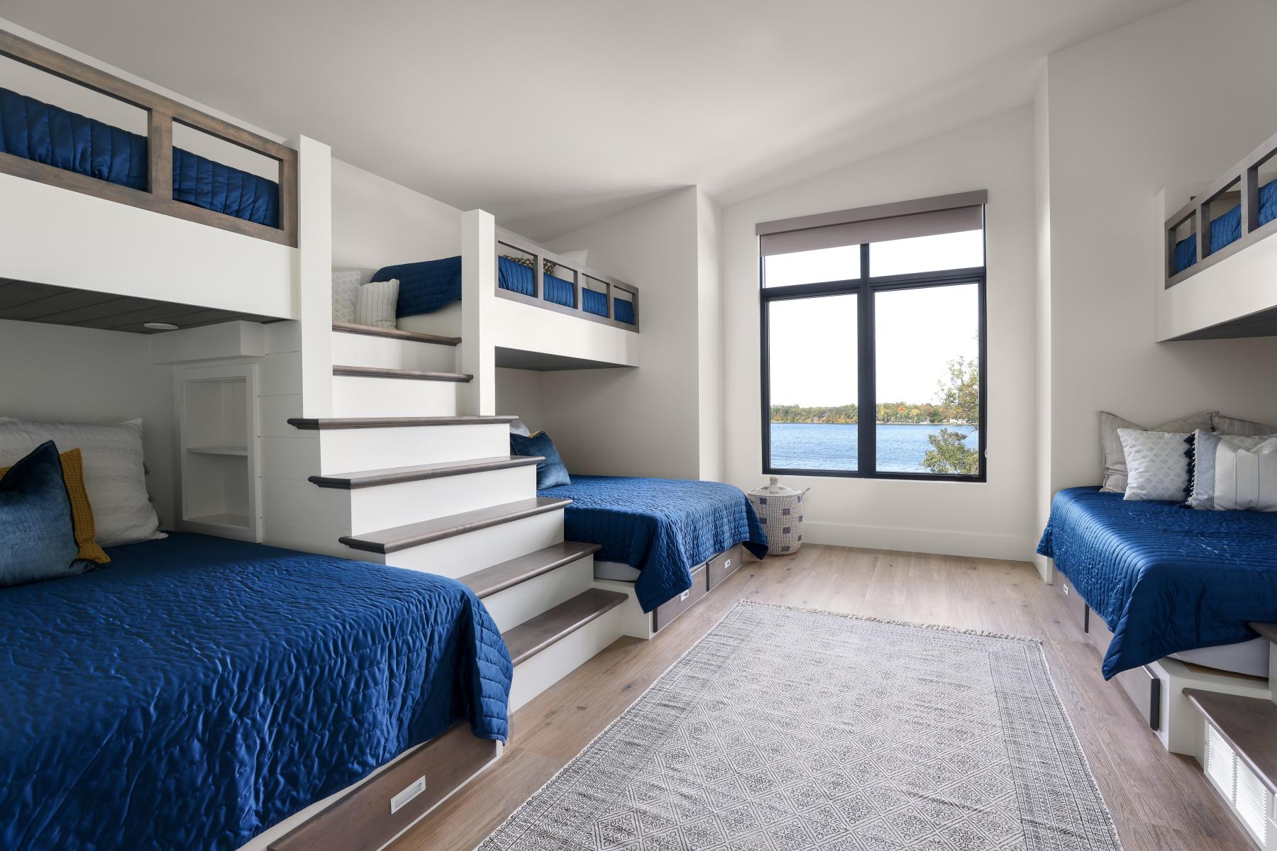 Custom bunk beds combined enameled finishes with natural wood stain, creating a welcoming sense of home for family and guests. The design extended seamlessly outdoors with a pass-through bar, stained shiplap, and beams that carried the same refined touches from the living areas to the lakeside patio.