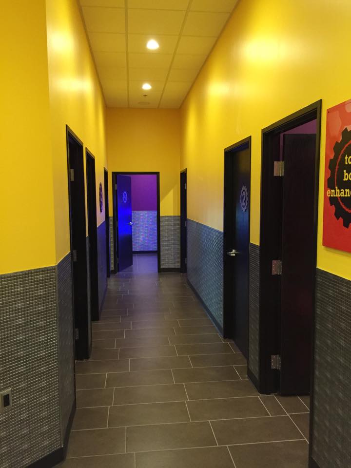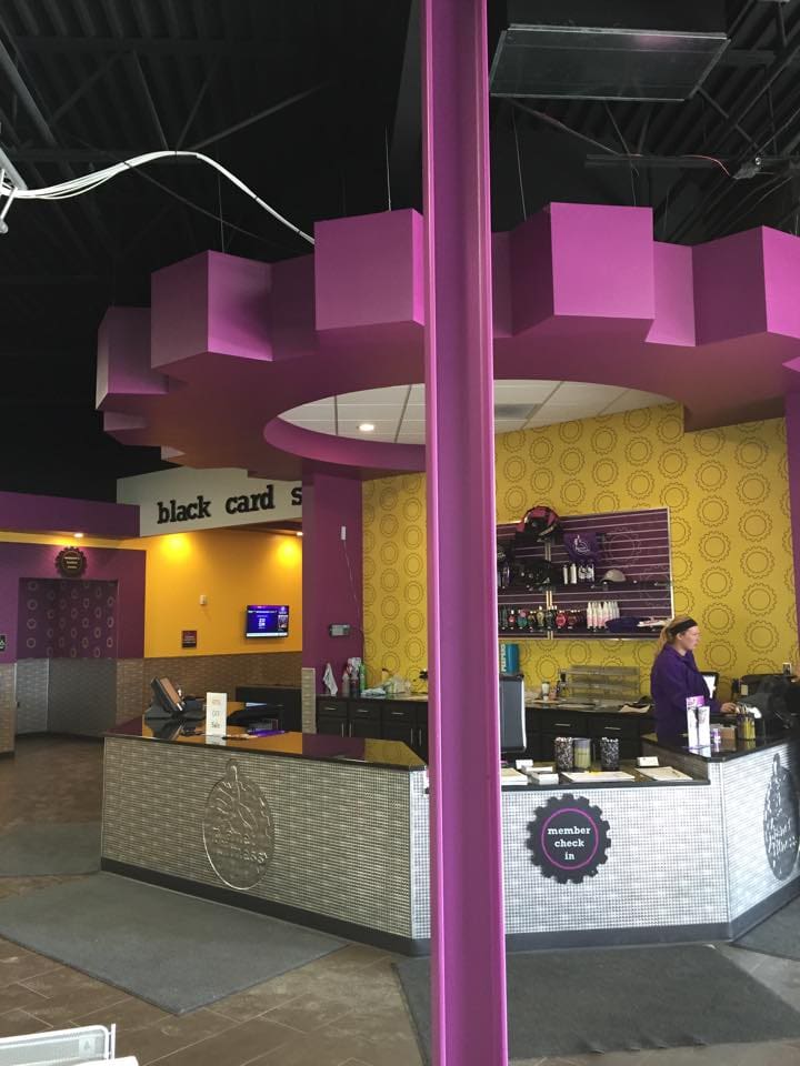 The scope included hanging sheetrock, taping, and smooth drywall finishes throughout. A crisp purple stripe was laid out with laser alignment, and custom drywall work brought the Planet Fitness gear logo at the entrance to life.