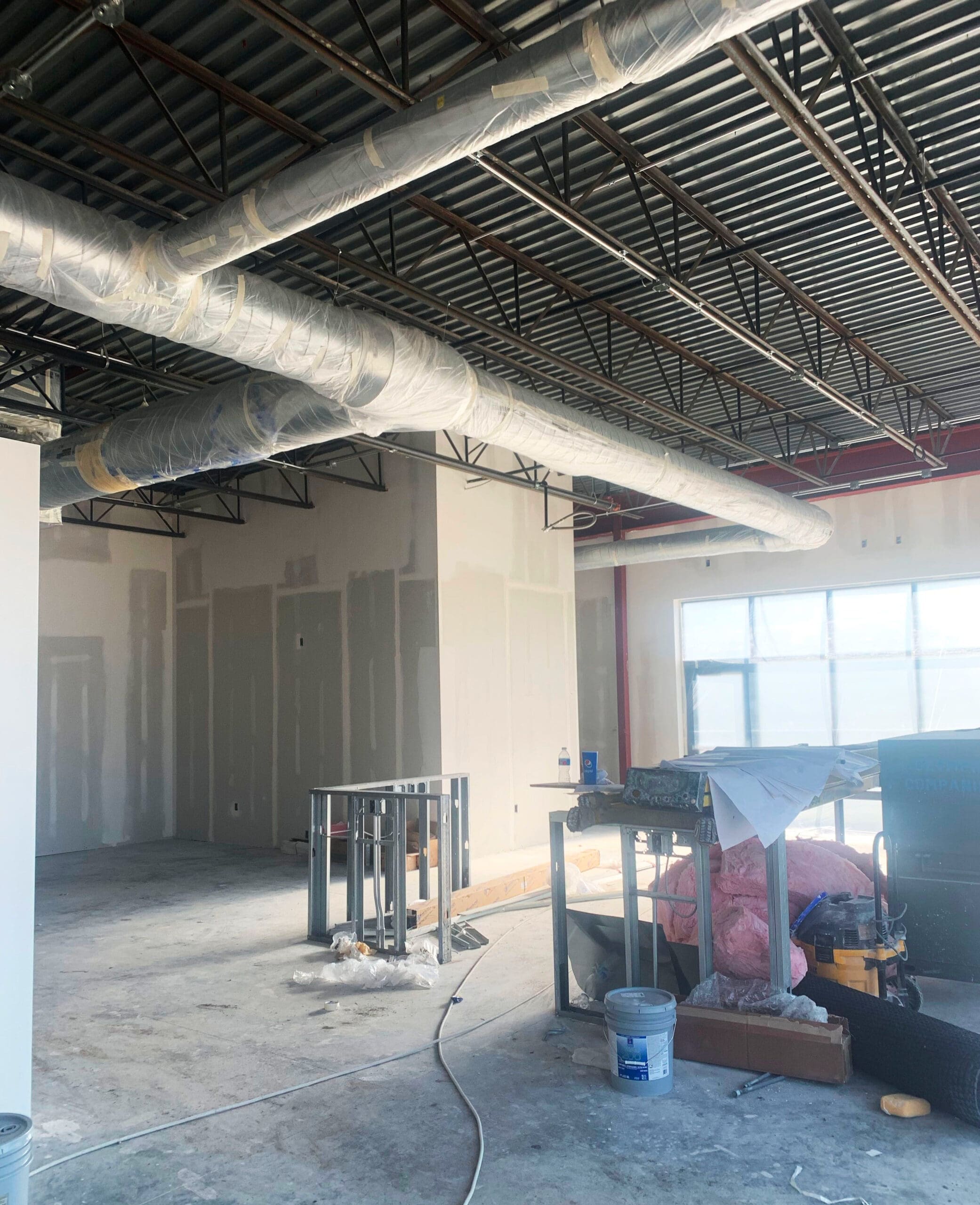 The bar joist and metal deck ceilings were sprayed in a custom black with a hint of a chocolate color to tie into their brand colors. A laser-sharp transition line separated walls from ceilings, creating contrast and allowing the branding to pop.