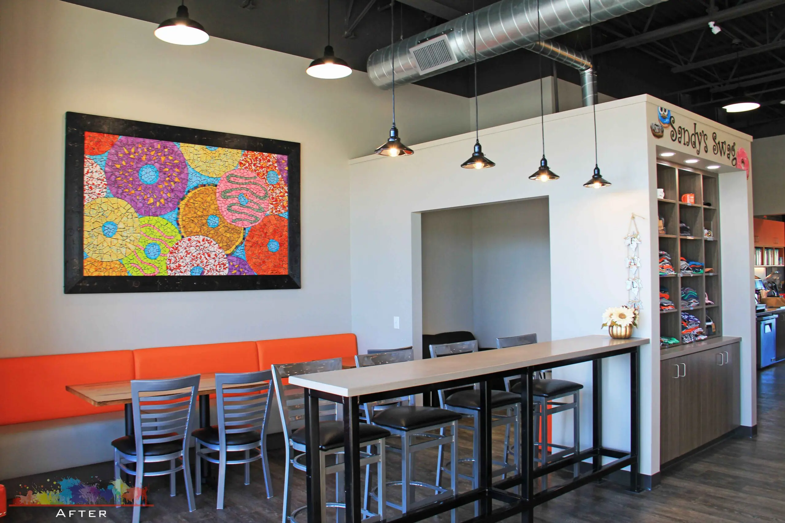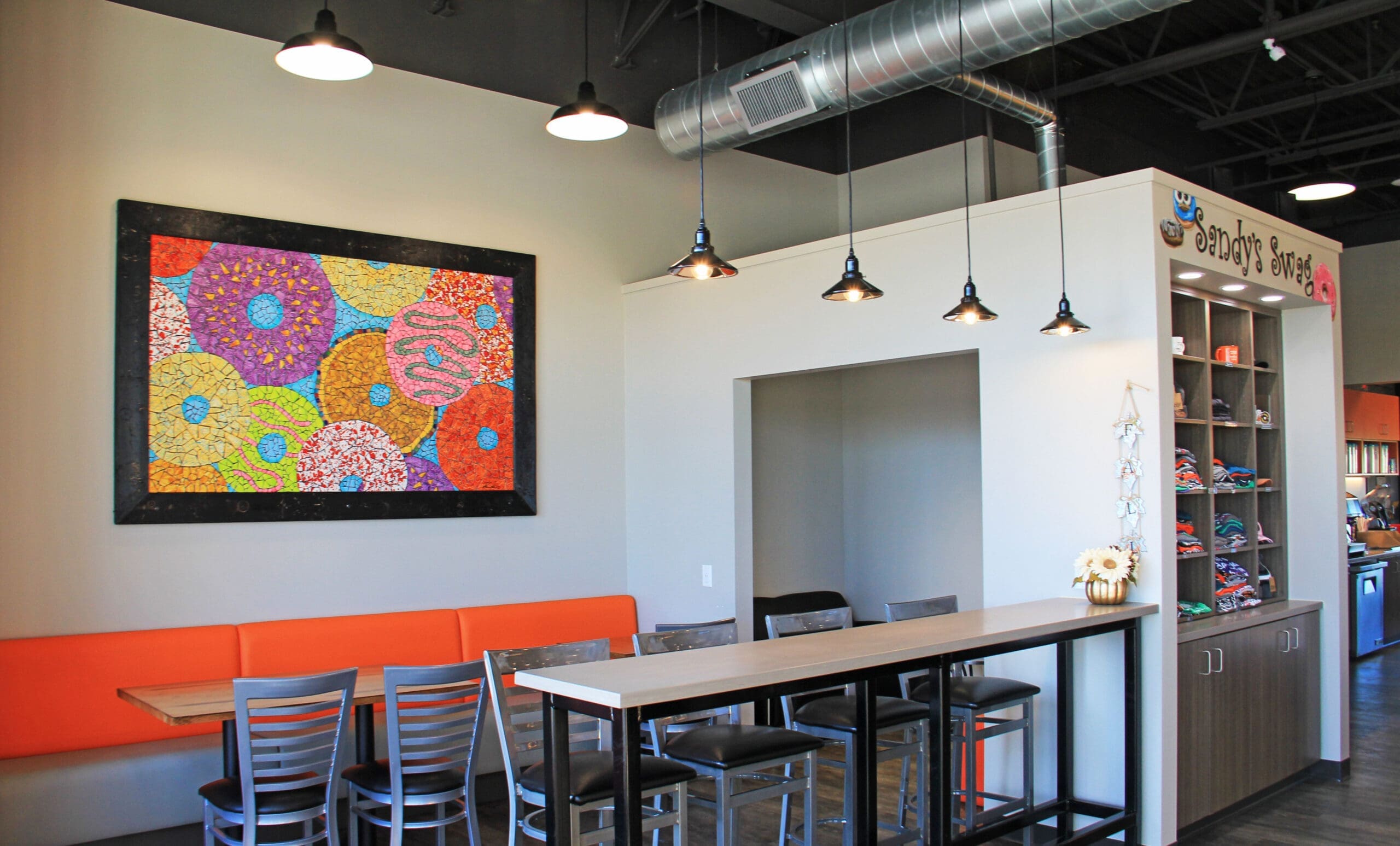 Sandy’s Donuts wanted a space that reflected their brand while keeping the energy focused on the product. With exposed ductwork left raw, the ceiling became the canvas.