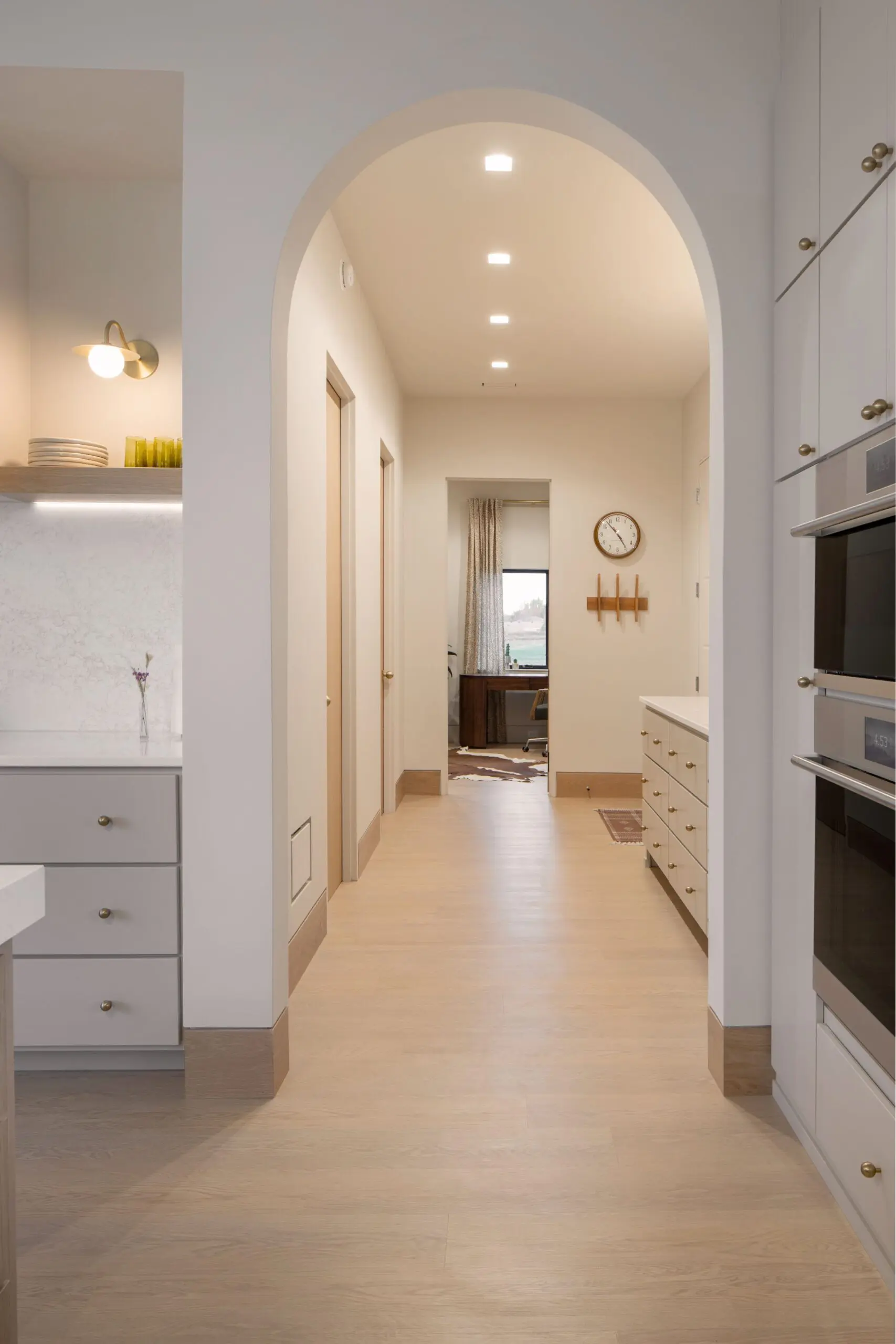 This Scandinavian-inspired home was designed around clean lines and subtle detail. Continuous arches and curved forms softened the modern geometry, while Riglet channels aligned seamlessly with flush white oak baseboards and doors.
