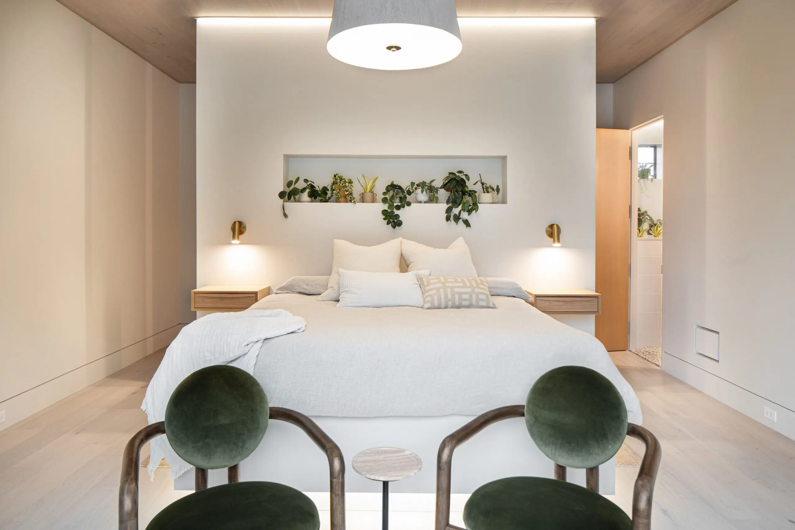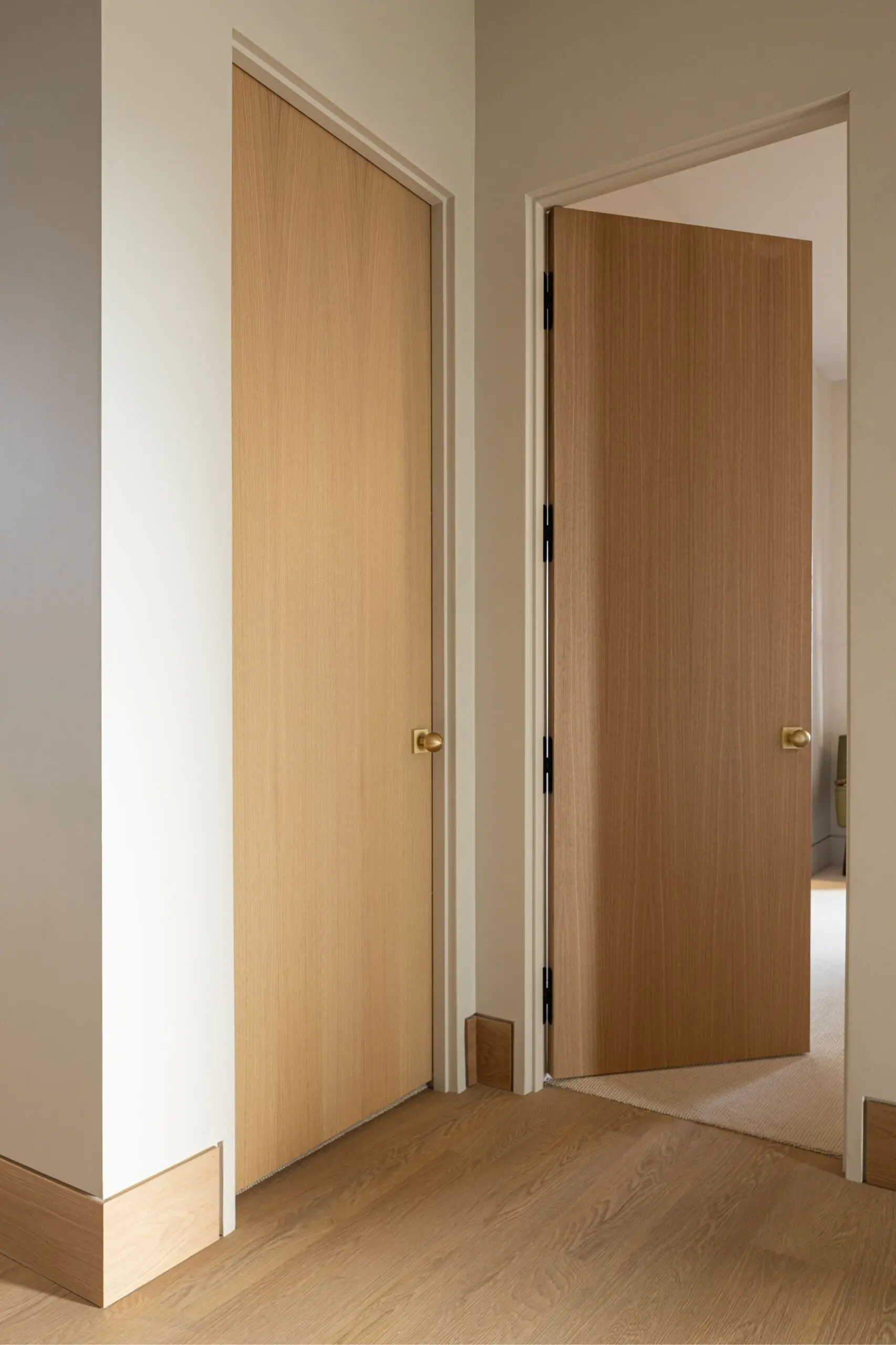 The scope included drywall installation, tape and mud, smooth drywall, sealing of white oak doors and trim, custom stain, and custom paint. Walls were finished in a subtle washable matte, paired with dead-flat ceilings in the same tone, with carefully chosen custom colors layered throughout.