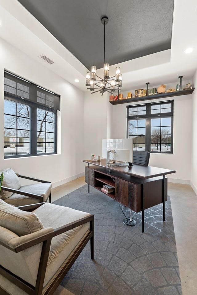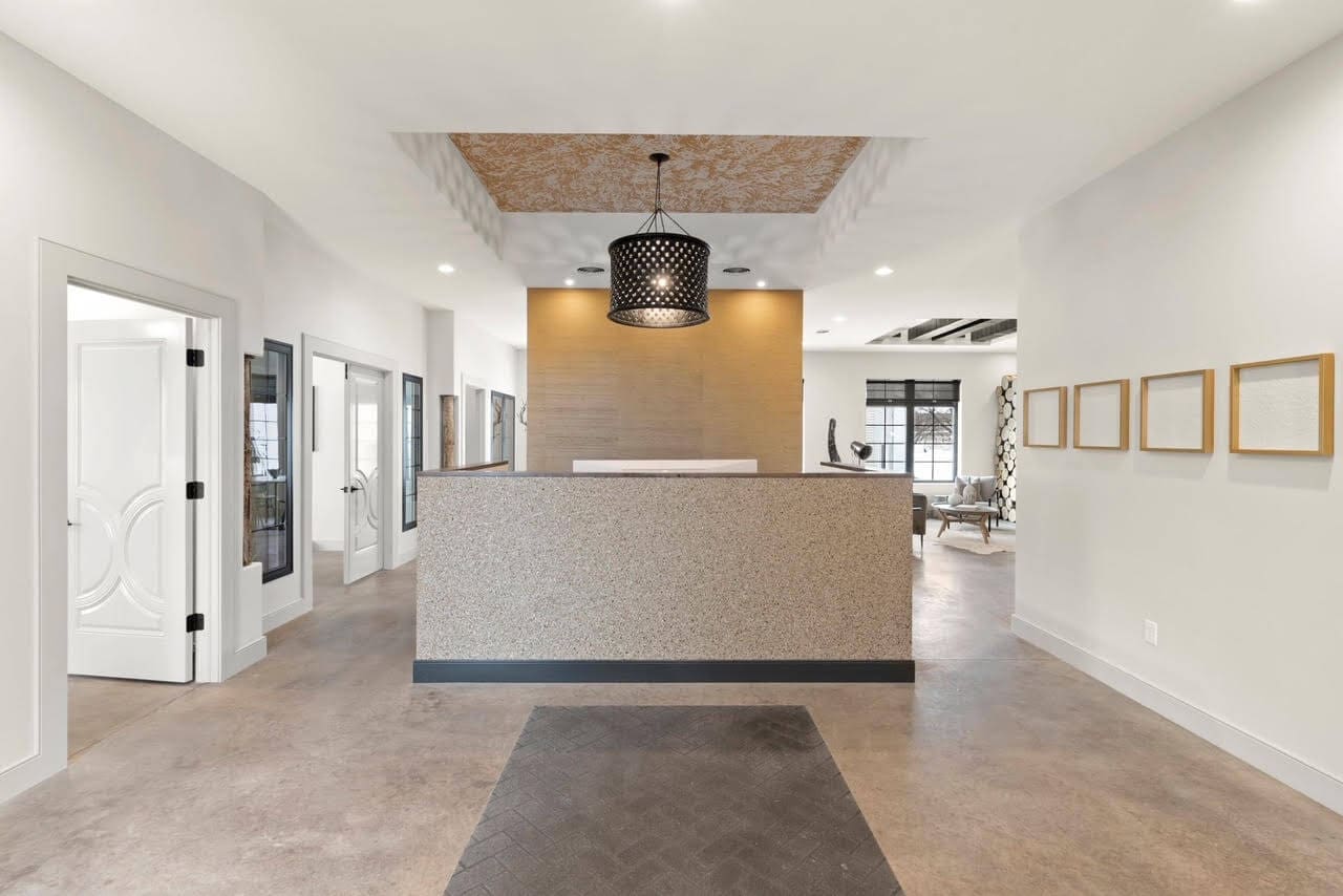 Inside, guests experience everything from high-gloss smooth drywall to heavy stomp, crow’s foot, skip trowel, knockdown, orange peel, and finesse. A gold riglet frames the fireplace, exposed trusses demonstrate open-ceiling options, and textured wallpaper replicates natural stone. Spanish oak cabinets in a dull-rub lacquer pair with matte walls and high-gloss doors, while acid-stained burnished floors expand the palette of options.